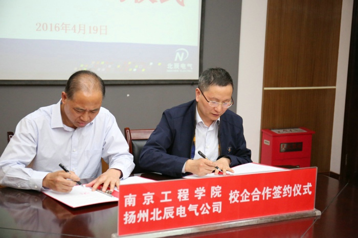 4月19日下午,“南京工程學(xué)院—揚(yáng)州北辰電氣設(shè)備有限公司”校企合作簽字儀式、“南京工程學(xué)院教學(xué)實(shí)習(xí)基地”揭牌儀式,在北辰電氣公司舉行。校企合作協(xié)議的簽約,標(biāo)志著公司與南京工程學(xué)院就產(chǎn)學(xué)研、人才培養(yǎng)、繼續(xù)教育等方面達(dá)成戰(zhàn)略合作。南京工程學(xué)院黨委副書(shū)記、副院長(zhǎng)陳德靜與揚(yáng)州北辰電氣公司總經(jīng)理呂清源代表雙方簽約。學(xué)院及北辰公司相關(guān)領(lǐng)導(dǎo)參加了此次揭牌儀式。