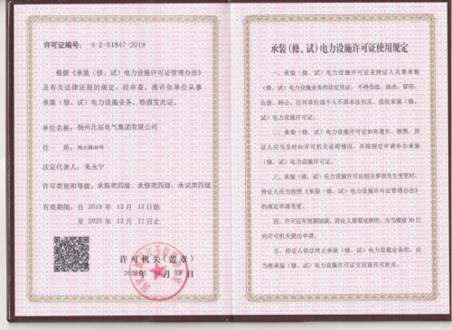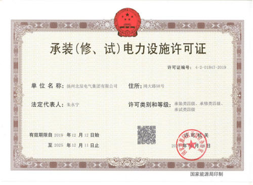 近日,經(jīng)國家能源局江蘇監(jiān)管辦核準,揚州北辰電氣集團有限公司獲批承裝(修、試)電力設(shè)施許可證四級資質(zhì)。將公司原有承裝(修、試)電力設(shè)施許可證五級資質(zhì)升級為四級資質(zhì),這標志著集團公司可從事35千伏以下電壓等級電力設(shè)施的安裝、維修、試驗相關(guān)業(yè)務(wù)。