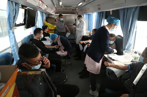 上午八點(diǎn)半,臨時(shí)體檢臺(tái)前等待獻(xiàn)血的員工們?cè)缫炎杂X(jué)排起隊(duì),填表、體檢、上車獻(xiàn)血,一切正有條不紊地進(jìn)行,愛(ài)心獻(xiàn)血車內(nèi)座無(wú)虛席。