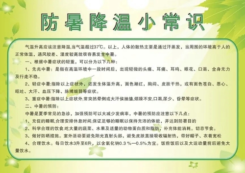 一是加強(qiáng)夏季防暑教育。入夏后,公司特邀揚(yáng)州市安全生產(chǎn)學(xué)會(huì)秘書(shū)長(zhǎng)朱建中針對(duì)夏季防火、用電、防暑應(yīng)急救護(hù)等知識(shí)開(kāi)展專題安全培訓(xùn),向員工講解防暑降溫的措施和用電等相關(guān)安全知識(shí),教育員工做好自我安全保護(hù)。公司還在廠區(qū)內(nèi)關(guān)鍵醒目位置還設(shè)置防暑降溫知識(shí)宣傳展板,并通過(guò)微信公眾號(hào)推送等形式,做好夏季高溫注意事項(xiàng)溫馨提示。